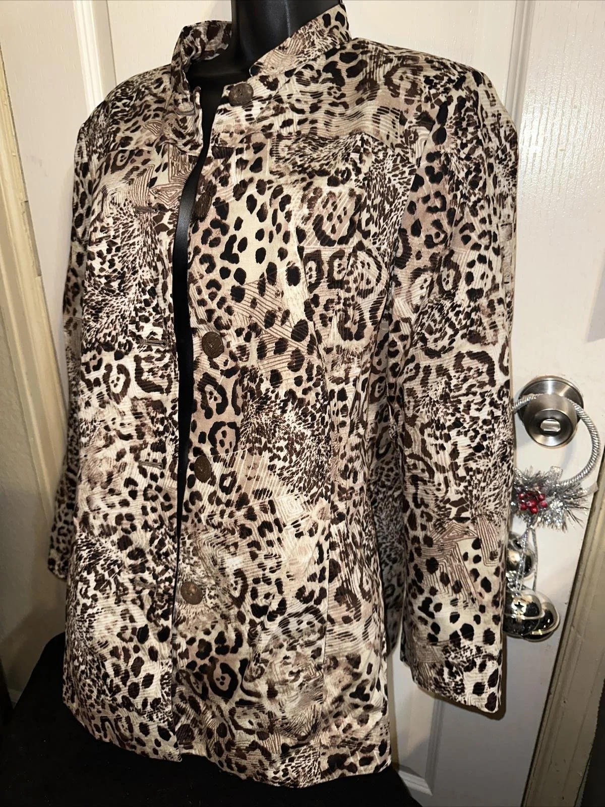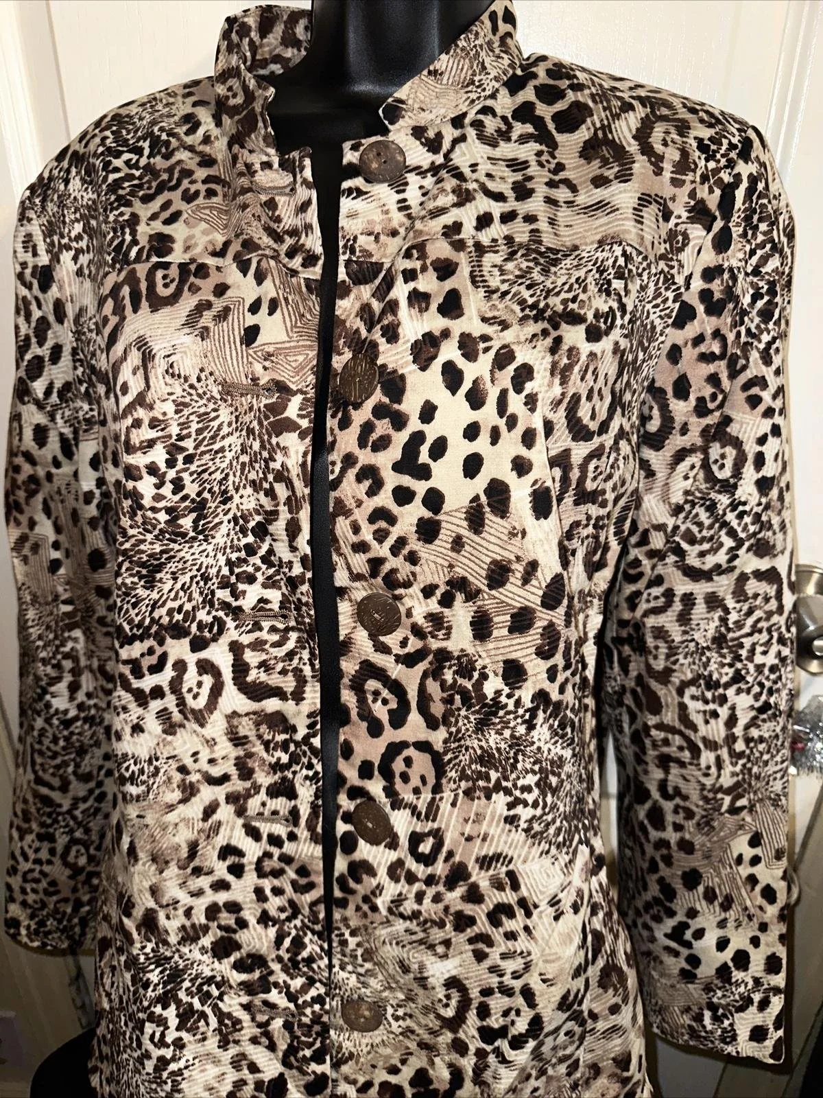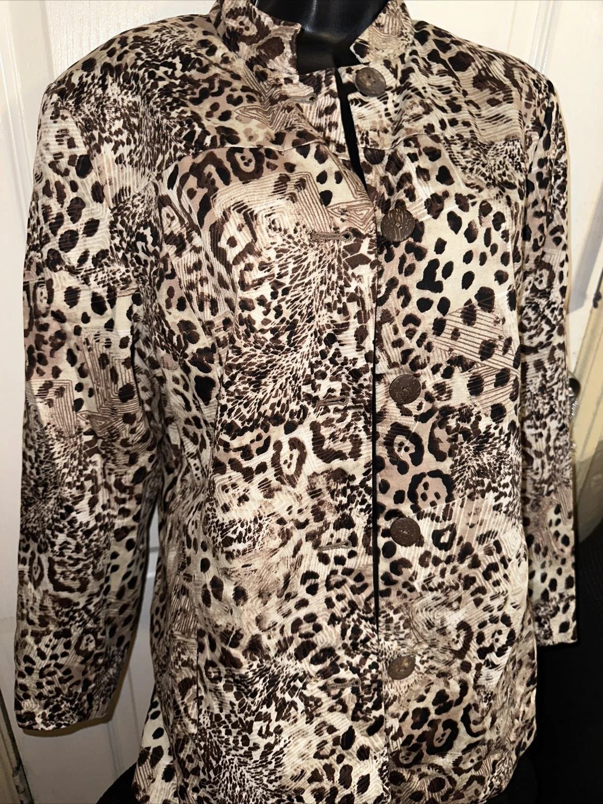 Features: ____mix colors _____ full button_____ great jacket ____very well taken care of____ cheetah print____